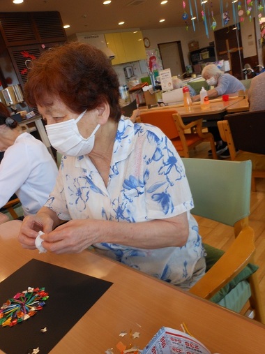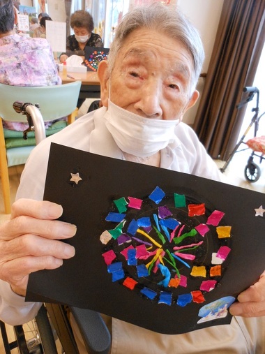 黒い台紙に丸めた花紙と折り紙を使い、花火を作りました。 色とりどりの素敵な花火が出来上がりました。