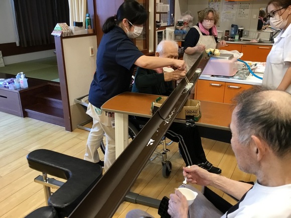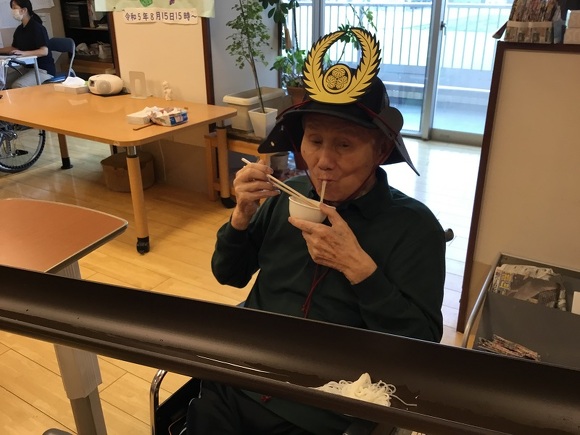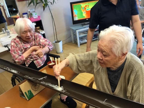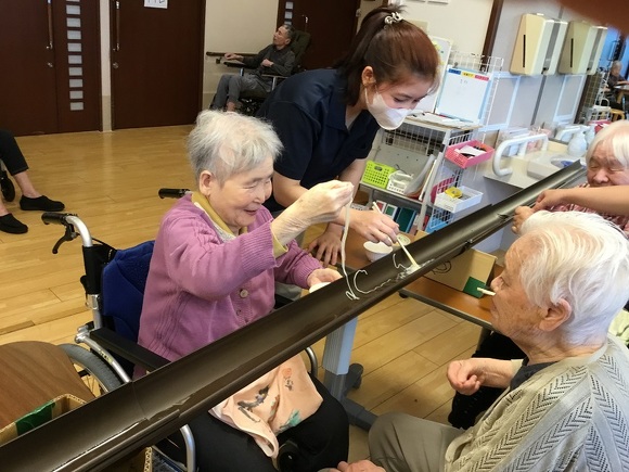 2023年08月15日(火) 流しそうめん 8月の暑い中、少しでも涼しんで頂こう!と、 流しそうめんを企画しました! また、海外からの実習生にも、日本ならではの 流しそうめんを体験してもらいました! 流れてくるそうめんをみなさんしっかりとキャッチして 楽しんで美味しく頂きました♥