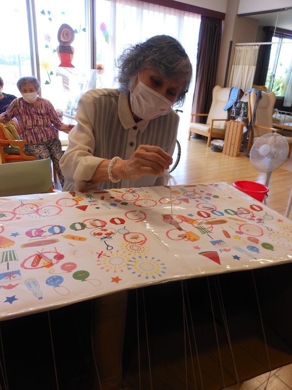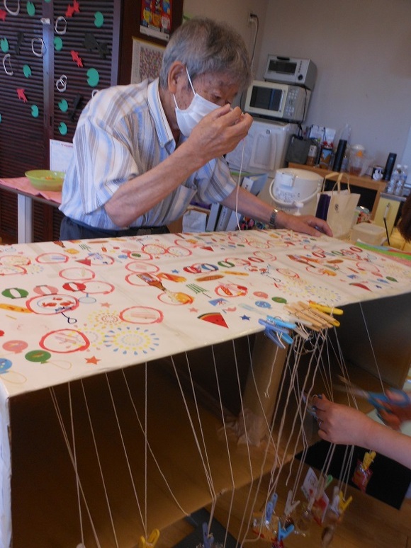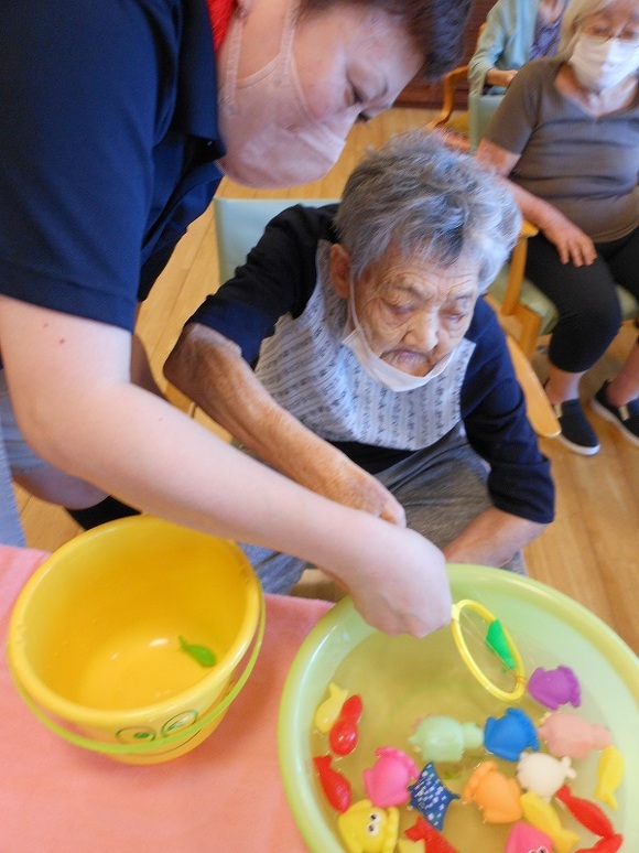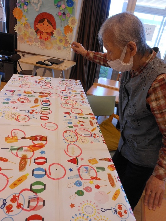 2023年08月10日(木) ど~れ~にしようかな♪ 今日は夏祭り♪ 金魚すくいや手作りの紐くじをしました。 紐の先には様々なお菓子がついています。 どの紐を引っ張るか、皆さま真剣に選んでおられました。 なにが出るかドキドキ・ワクワク♪ 景品のお菓子はお持ち帰りしました。