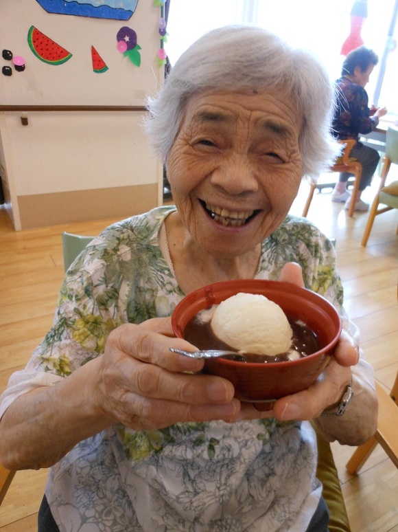 2023年08月14日(月) ひんやりおいしいもの♡ 夏はあつ~いので、おやつには冷たい物が食べたくなりませんか? そこで今回の手作りおやつは『冷やしぜんざい』! 美味しい冷やしぜんざいに、さらにアイスクリームを入れました。 「冷たくてあま~い」「美味しいね」「また食べたい」と 皆さん笑顔がいっぱいでした♪