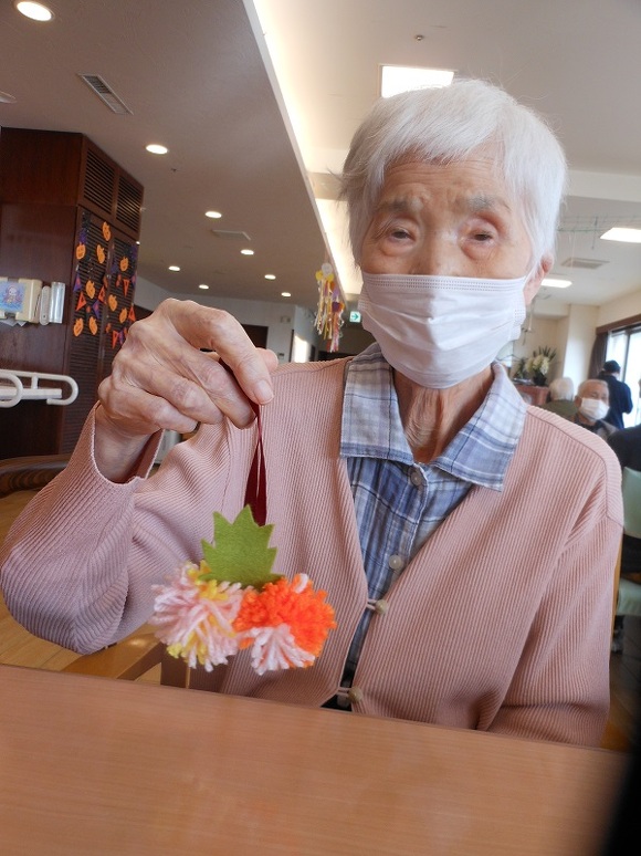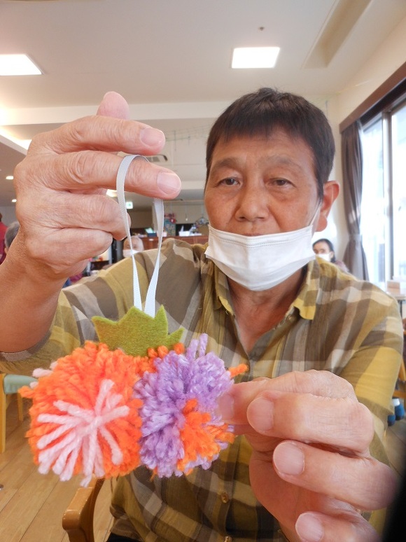 2023年09月22日(金) 小さい秋見つけた 2色の毛糸をぐるぐる巻き、ぽんぽん菊を作りました。 形を整えながら丸く切る作業は難しさもありましたが、 集中して取り組む姿が見られました。 ハサミを使うことが難しい方はお隣の方が手伝う様子も見れ、 1つ1つ違う菊が出来ました。 完成した菊はまん丸で柔らかく、可愛らしく見てて癒されました♥ 出来上がった時の皆様の表情も優しく嬉しそうでした。 お部屋に飾ったりバッグに下げたりして秋を楽しみましょう!(^^)!