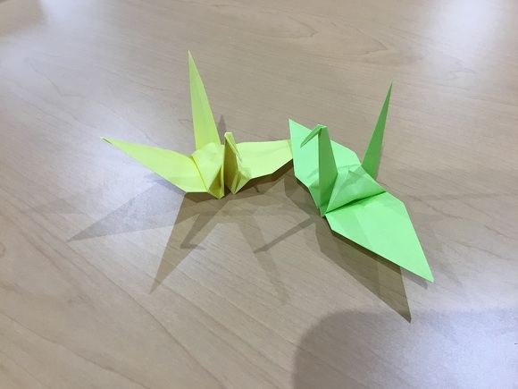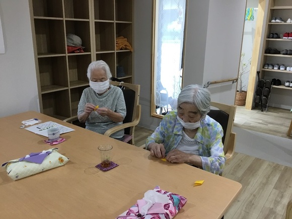 2023年09月12日(火) 折り鶴 手先が器用な利用者様と折り鶴を折ってみました。 利用者様に色を選んでいただき、折り始めてみたら 昔を思い出したように笑顔で上手におられていました!(^^♪ 頑張って完成させた折り鶴をみて喜ばれ、 ご自宅に持って帰られる方もおられました♪