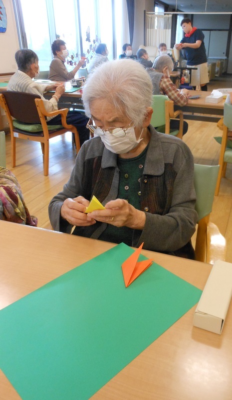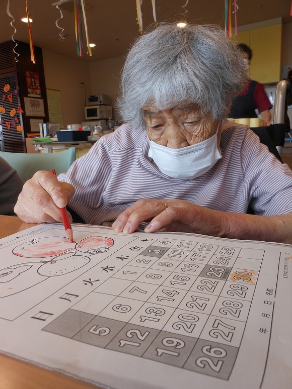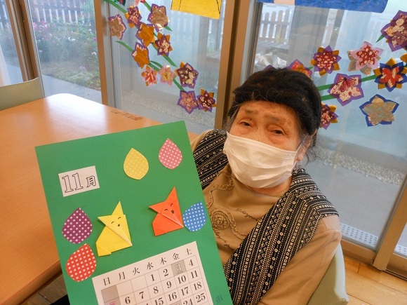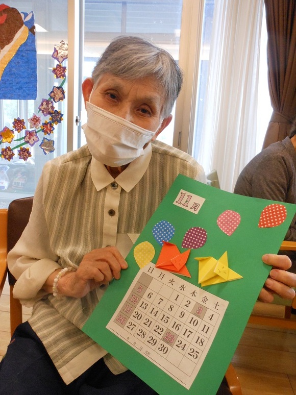 2023年10月05日(木) 芸術の秋<カレンダー作り> 今日は可愛らしい11月のカレンダーを皆さんと作りました! ・キツネの折り紙と菊 ・秋の果物の塗り絵 からお好きな方を選んでいただきました。 愛らしい2匹のキツネに各々の描く表情が可愛らしいです。 秋の果物も色鮮やかに塗られ、素敵に仕上がりました。 「もう今年も、あと3ヵ月かぁ…時が経つのは早い!!」 「でもまだ3ヵ月ある!」 と驚きと、まだまだの気持ちで皆さん一生懸命取り組まれました。