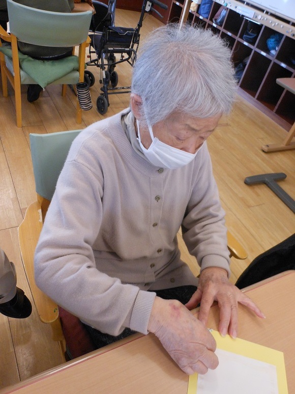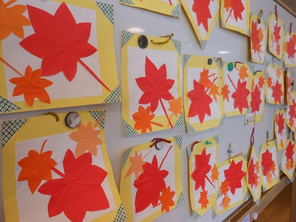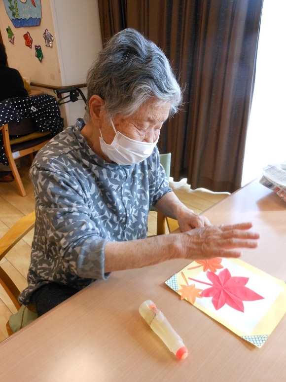 2023年10月16日(月) 紅葉創作 今年の紅葉はとてもきれいですね。 菜の花でも季節の創作『紅葉創作』をしました。 事前に利用者様に作ってもらった沢山の紅葉。 「ここかな?」「斜めに貼ろうかな?」など悩みながらも 台紙にバランスよく貼り、ステキな作品が出来上がりました。