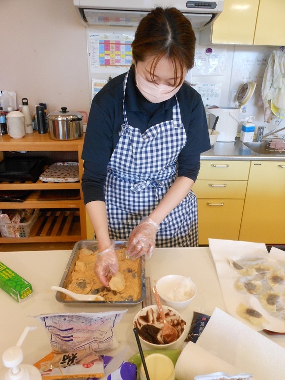 2023年11月08日(水) 京の味 京の味を堪能していただきたく、京のみやげの定番「八つ橋」を なんと!餃子の皮で作りました! お餅は使っていないのに、まるで八つ橋!? 後で餃子の皮と知って驚いた方もおいでました! きな粉と餡子の味にほっこりし、皆さんの表情も緩みます。 「家でも作ってみるわ!」とレシピを聞かれた方もおいでましたよ! 作るのもとっても楽しかったですよ♪皆さんもお試しあれ~