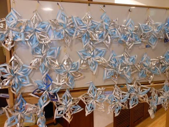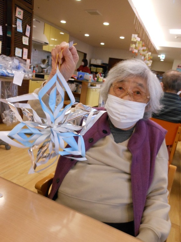 2023年12月05日(火) きらきら雪の結晶 本日はきらきら綺麗な雪の結晶を作りました。 2色の折り紙を交互に貼りました♪ 交互に糊で貼るのが難しかったですが、 完成した作品を見た時は 「すごい!」「きれい☆」と たくさんの声が聞かれました。