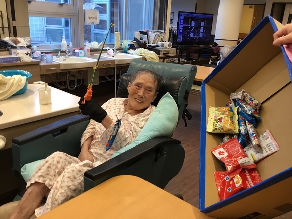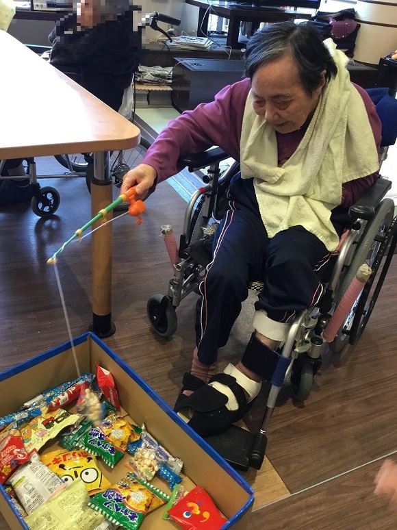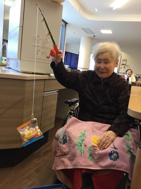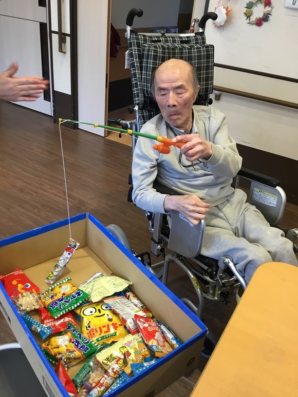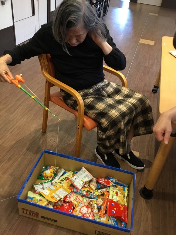 2024年01月15日(月) お菓子を釣って盛り上がろう! お菓子釣りを皆さんで楽しみました♪ より大きいお菓子を狙って「そこや!」「もちょっとこっちやな」 と楽しんでいました。 上手くお菓子が釣れると「よっしゃ!大物や!」 と喜ばれとても楽しまれました。