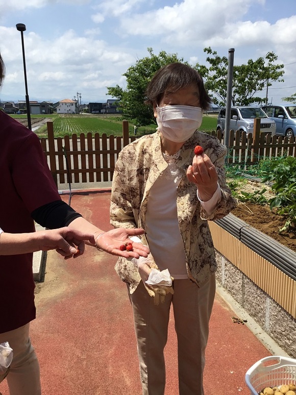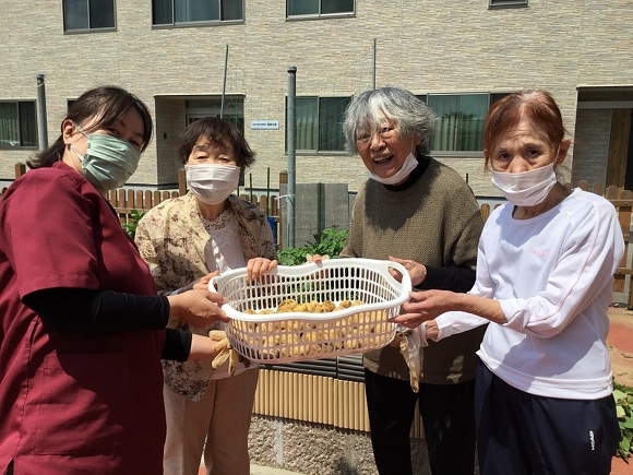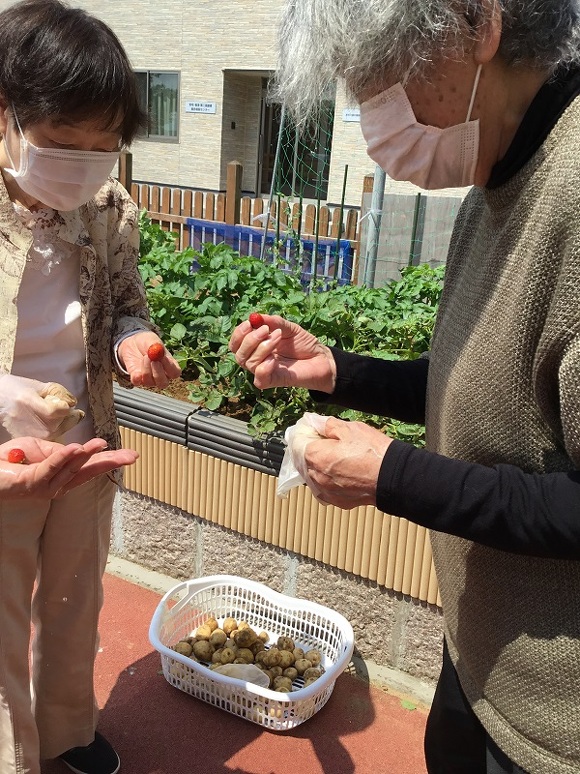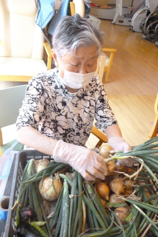2024年06月04日(火) じゃがいもと玉ねぎ収穫 じゃがいもと玉ねぎを収穫しました。 そして、今年最後のイチゴも皆に内緒でパクリ♡ とれたてのじゃがいもはふかしてお昼に皆で食べました。 ホクホクで柔らかく美味しかった!と声が聞かれました。 玉ねぎは畑のベテランさんに結んでもらいました。 手際よく、根っこの処理やネギの部分もサクサクと切って 吊るしやすいようにしてくれました。 小さい玉ねぎを見て「なんやこれ~!」と大笑いもされました(^O^) 来年はもっと大きな玉ねぎ育てるぞー!! 農園ではきゅうりの花が咲いてるよ♪ 次の収穫はきゅうりかな!?