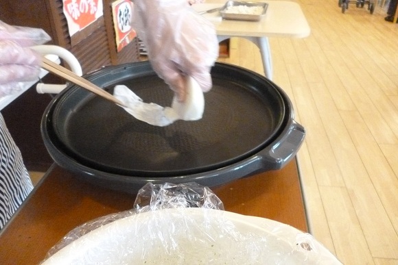 2024年06月20日(木) ひとくちかき餅&シルク餅 お餅を使って“2種類のおやつ”を作りました。 1つ目は“シルク餅”! ホットプレートにお餅をギュっと押しつけると、 溶けたお餅がうすーくなり 皆さま「おー」と驚いておられました。 2つ目は“ひとくちかき餅”。 小さく切ったお餅を油で揚げ、 きな粉・あおさ・塩の3つの味を作りました♪ 「私きな粉おかわり!」「ぜーんぶ欲しい~」 たくさん作りとても好評でした(^O^)