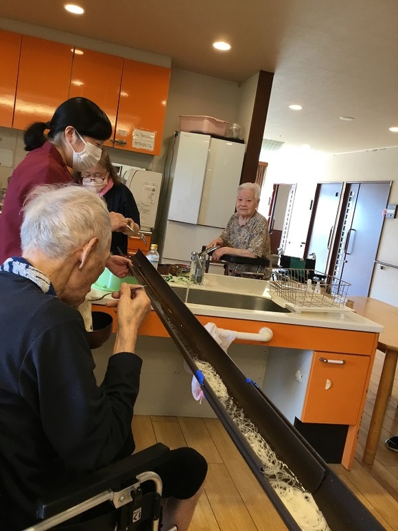 2024年08月13日(火) 流しそうめんを楽しもう 去年も好評だった『流しそうめん』を 暑い夏の到来に合わせて企画しました☆ 流れてくるそうめんを箸ですくい、口に運んで冷たーいご馳走を堪能♪ 「美味しいからたくさん食べれるね」と喜びの声もいただきました。 暑い夏は始まったばかりですが、暑い夏を乗り切りましょうね♥