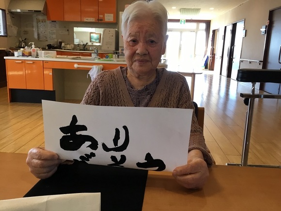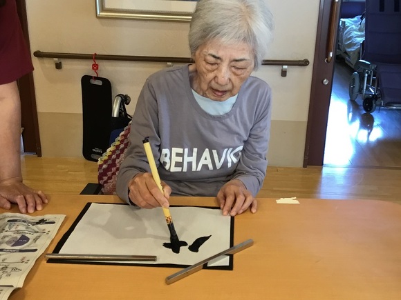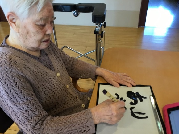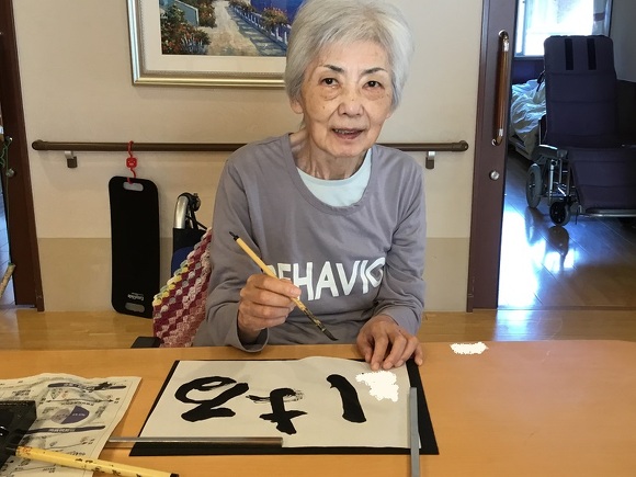 2024年10月17日(木) 県民書道展覧会に向けて力作を 毎年恒例の石川県民書道展に向けて筆を執りました。 出来上がった作品を手に取り 「よくできたわ、キレイに書けた!」 「筆で書くとなかなか難しいね」 など感想は様々♪ 書き上がった作品はフロアの廊下に飾る方、 飾らずに記念としてお部屋に飾る方もいらっしゃいました。 中には「せっかくだから書いてる所も写真撮ってください! 1回で書いてるからね」と写真のリクエストも出たり とても盛り上がっていました♪