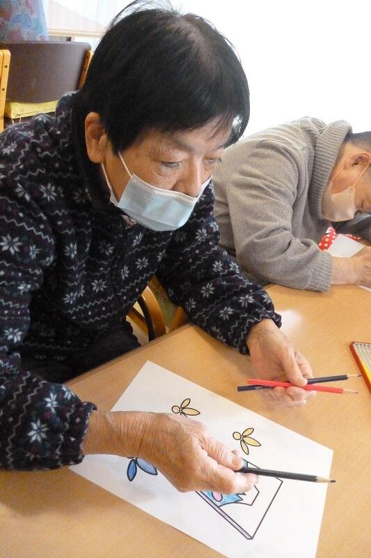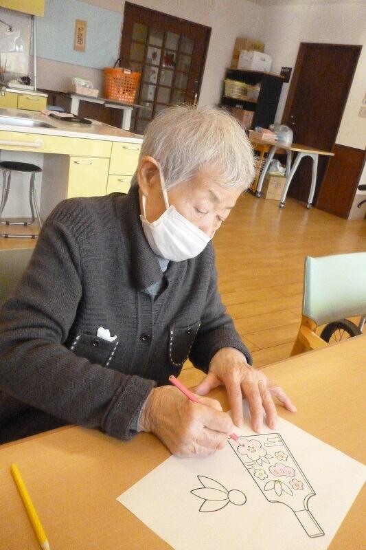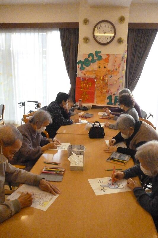 2025年01月04日(土) 羽子板塗り絵 色々な羽子板の塗り絵の中から お好きな柄を選んで塗っていただきました。 「簡単なのにするわ~」「これいいかな?」 塗り絵の絵柄を見比べ選んでいました。 じっくり何色がいいか考えながら丁寧に塗る方や 大胆に塗る方など様々でした(^O^)