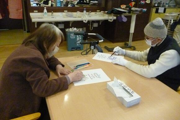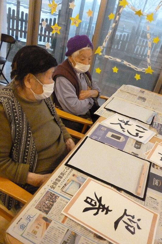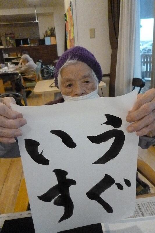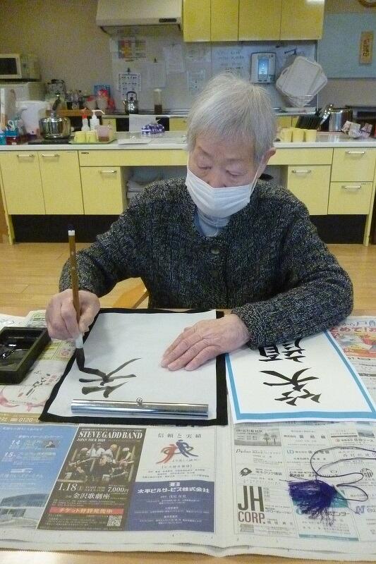 2025年01月06日(月) 書き初め 新年と言えば書き初め!! レクリエーションで書き初めをしました。 ・筆で書く ・お手本を印刷した物に色鉛筆で塗る のどちらか好きな方を選んでいただき それぞれ思い思いに取り組まれました。 筆で書かれた方は好きな字を書いたり、 お手本を見て書いており 色鉛筆で塗る方は何種類かの中から、 “宝船”“新春”等の文字を塗られてました!!