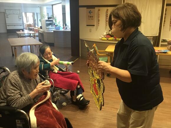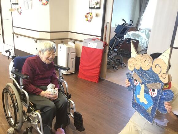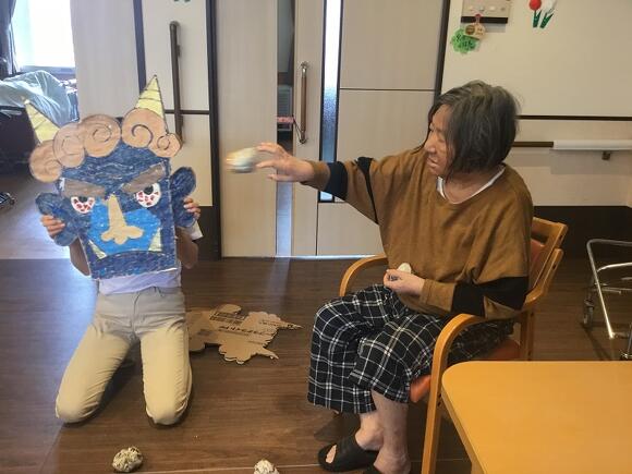 2025年02月02日(日) 節分で鬼退治! 毎年の恒例行事の節分! スタッフの持つ鬼の面へ目掛けて新聞紙を丸めたボールを 「鬼は外!福は内!」と元気よく声を出して投げていました。 「なかなか当たらんな~」と皆さん楽しまれていました。