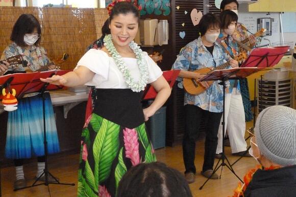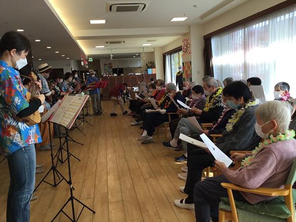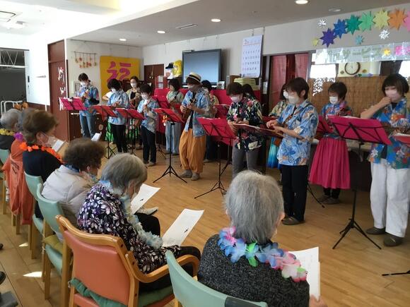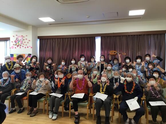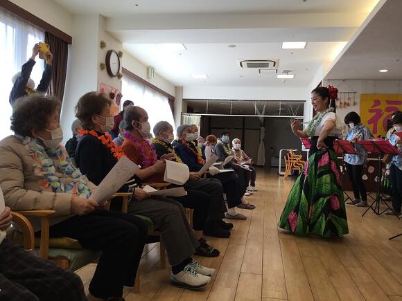 2025年02月15日(土) ウクレレとフラダンス(ボランティア) 約1年と少しぶりに、大好評だったフラダンス&ウクレレのボランティア様来訪!! 「あーっ見た事あるわ!」「覚えとるよー!」と 一部の利用者様が笑顔でボランティアの方々に声をかけていました! 数曲を歌いながら体操もあり、皆様楽しまれていました。 最後に全員での記念撮影もパシャリ!!