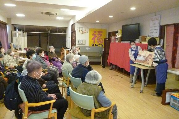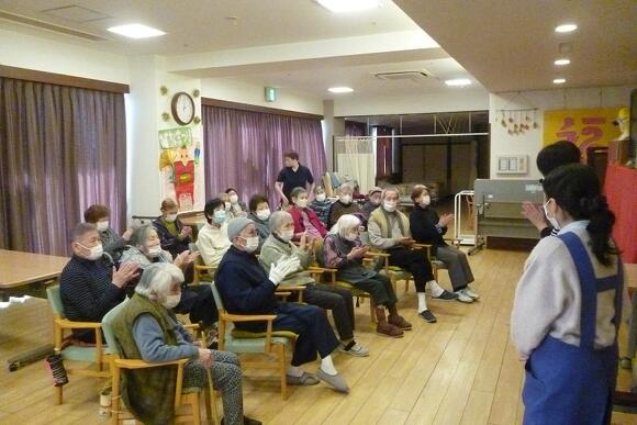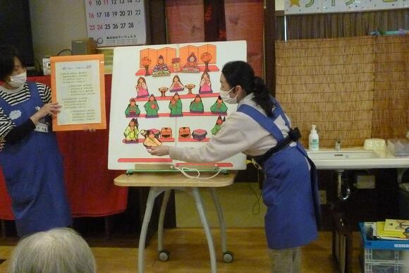 2025年02月27日(木) 小松 お話しの会(ボランティア) 『森のおふろ』『こたつ牛』『かさじぞう』『雛祭り』と 色々な絵本や紙芝居などの読み聞かせをしてくださいました! 『森のおふろ』の絵本では、ライオン→象→ワニ→… さまざまな動物が順に背中を流しあい、 最後には一緒のお風呂に仲良く浸かるという内容でした。 また、【せっせっせ】や【茶摘み】などの昔遊びの手遊びで 利用者様と一緒に体を動かしました! 雛祭りの歌に合わせひな壇を飾ったりし 心穏やかな時間を過ごしました。