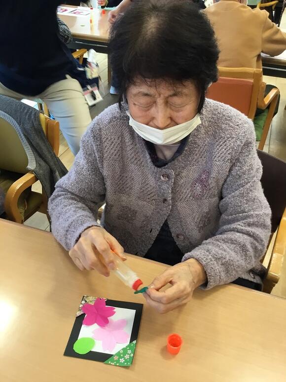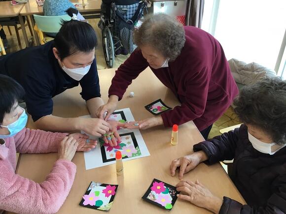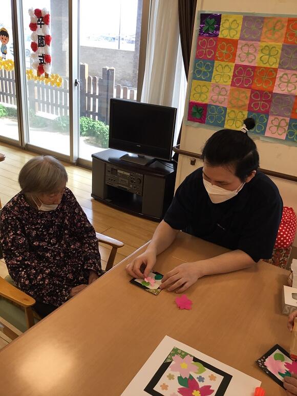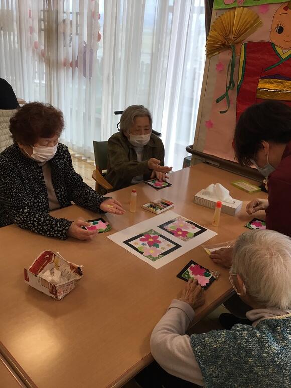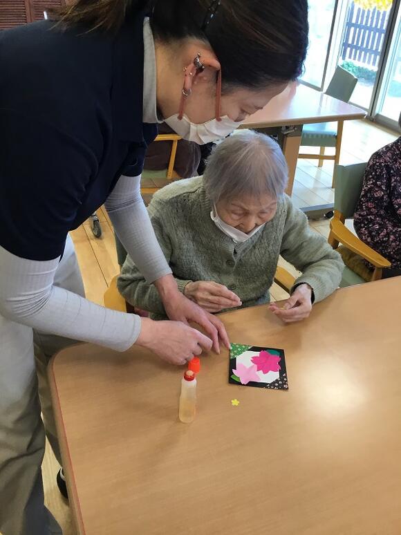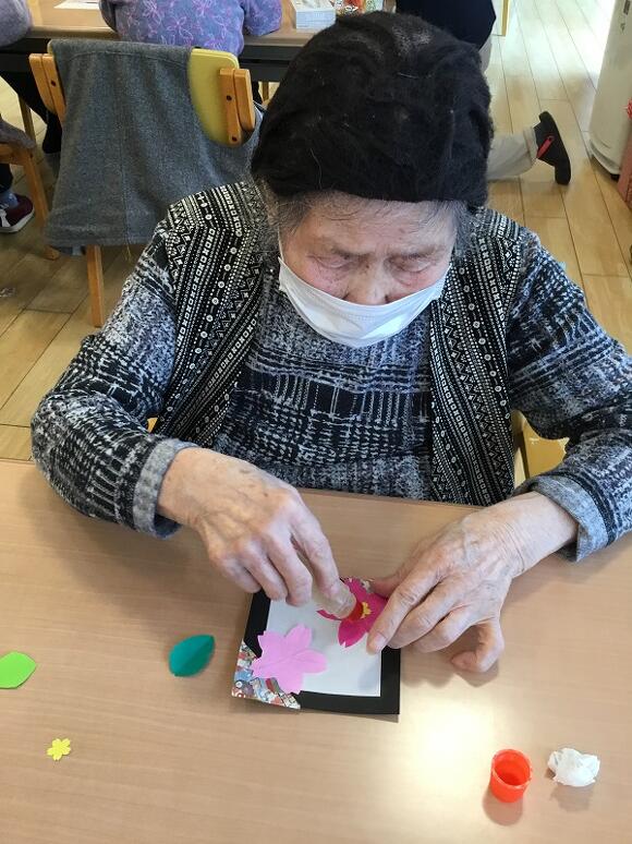 2025年03月15日(土) 桜の創作 皆さんに台紙・桜のパーツ等をお配りし、作って頂きました。 お手本をしっかり見ていた方からは 「これまだけ?」「次これやろ?」 なかなか先の工程へ進めない方は 「う~ん、どうすればいいんけ?」と悩んだり… ご利用者に合わせ創作を進めていき、 最後に小さな桜を貼り、綺麗に仕上げていました。