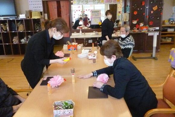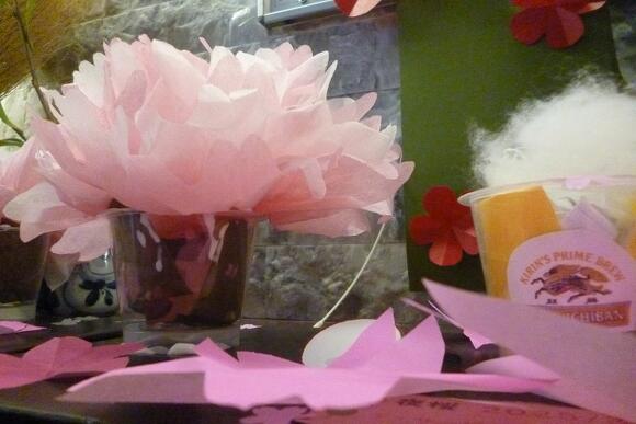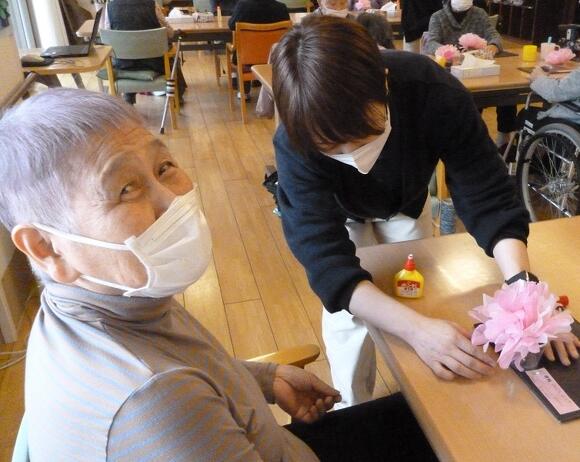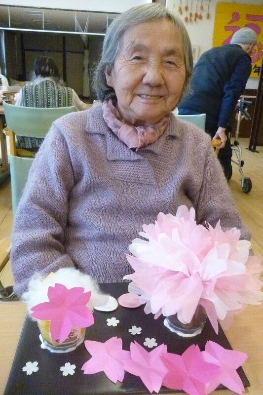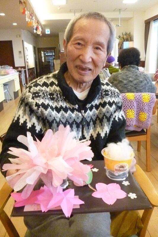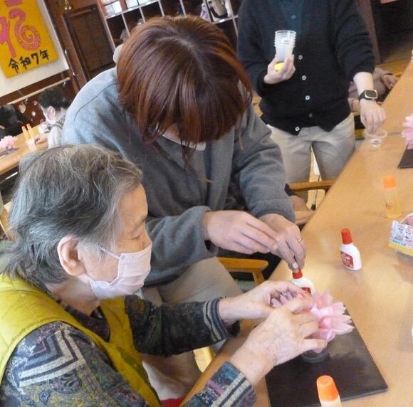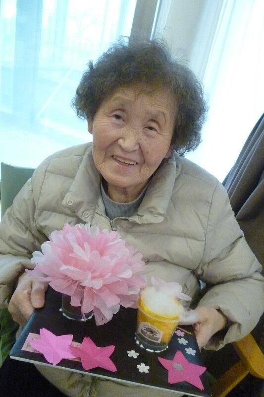 2025年03月17日(月) お花見気分♪ 今日の桜の創作は『夜桜の花見』をテーマに作りました。 黒の台紙に花紙で作った桜の木や3色団子。 そして!特大ビール!! 「桜きれいやね~」 「黄色いのなんや?」(ビールです…) 「昔、芦城公園で桜見ながら飲んだわ~」 など、色々な声が聞こえてきました。 仕上げに桜の花を好きな所に散らして出来上がり! 桜の開花が待ち遠しいですね(^O^)