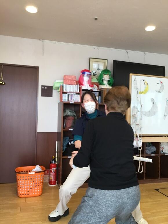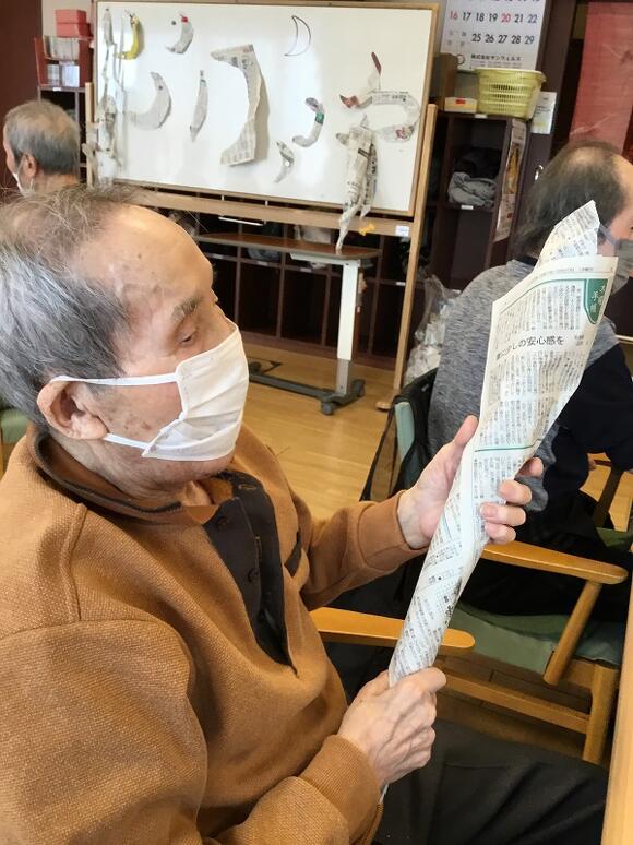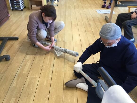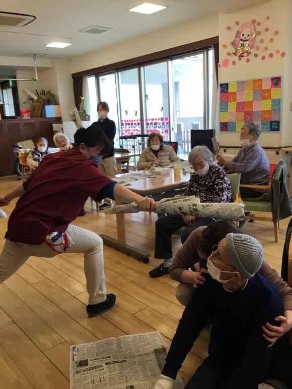 2025年03月29日(土) 新聞で… 今日のレクリエーションは新聞を使って、 お題の形を指でちぎっていくゲームです。 新聞はなかなか思い通りには切れず悪戦苦闘!! お題が蛇の時は、蛇の舌や体のうねりを表現したり、 長さを重視する方、とぐろを作る方など様々でした。 最後のお題はバットです。 バットの形に切っていくと思ったら… 皆さん新聞を丸め出し、職員も丸め出し、チャンバラごっこの始まりです。 最後は皆さん大笑いでレクリエーションが終了しました(笑)