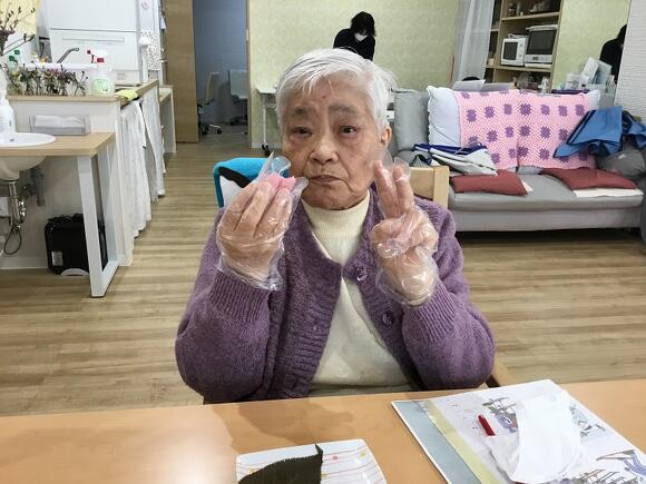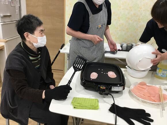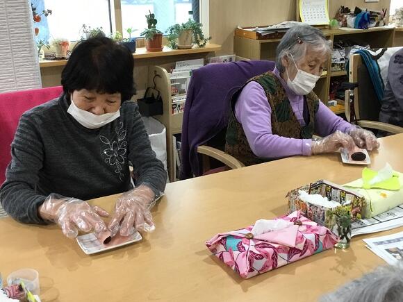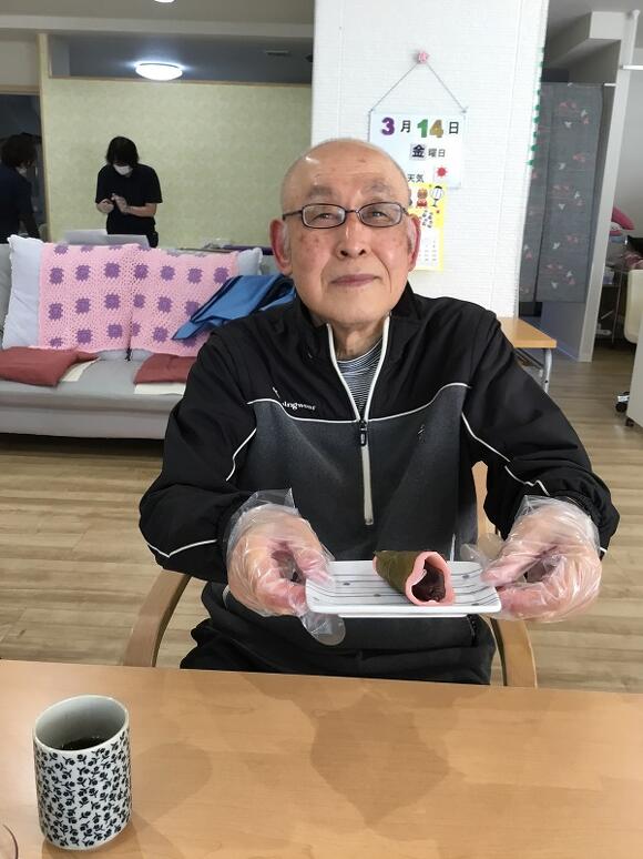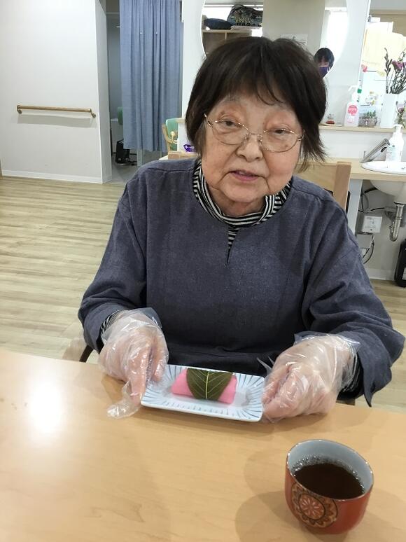 2025年03月14日(金) 手作りさくら餅 手作りおやつで『さくら餅』を作りました♪ 「季節のもんやから食べられて嬉しい!」 「家じゃ食べられんから美味しい!」 の声。とっても好評でした♥ 利用者様にもお手伝いをお願いし、白玉粉・小麦粉などを 混ぜ合わせた生地をほんのりピンク色に染めて、 ホットプレートで生地を薄く焼きました。 最後の仕上げは、利用者様がそれぞれご自分で 餡子に生地と桜の葉を巻いて仕上げをしました。 自分で巻いたさくら餅はまた格別に美味しいですね(^^♪