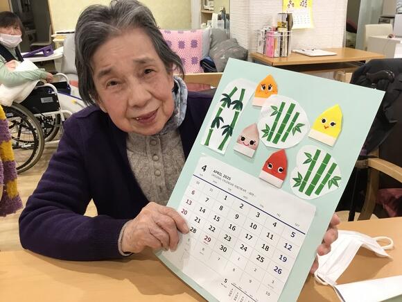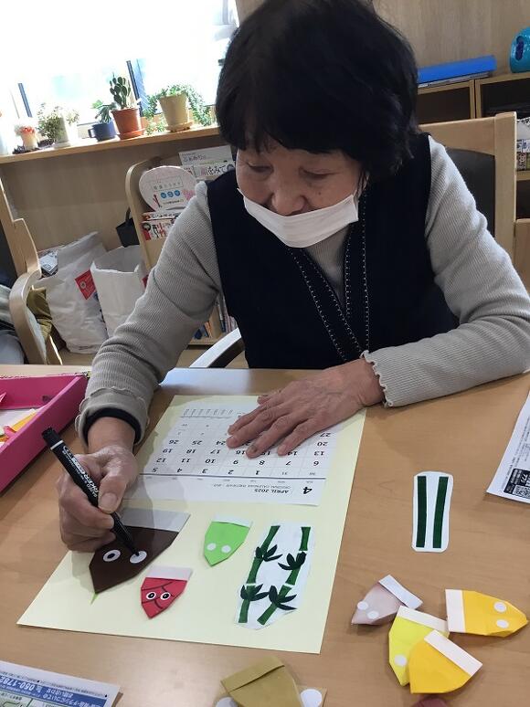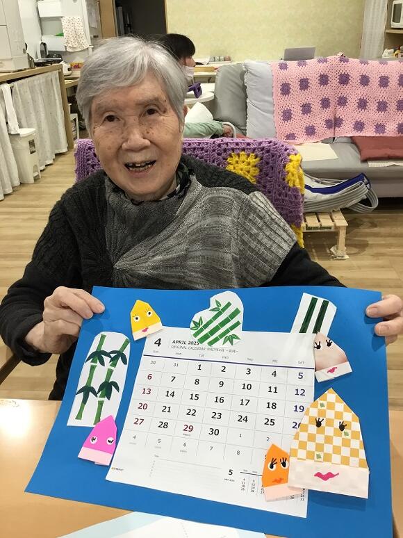 2025年03月20日(木) 旬の!たけのこカレンダー 春です!春といったら…たけのこ! 毎月恒例となってきたカレンダー創作、4月は可愛い『たけのこ』です! 茶色以外にも、様々な色や柄のたけのこを自由に貼っていただきました。 画用紙を横に使ったり、可愛く目を描いたり、まつげを描いたり… 皆さんの個性が光りますね(*'ω'*) 今年は「表の年?裏の年やっけ?」「たけのこご飯食べたいね~」 などの会話も聞こえてきました♪