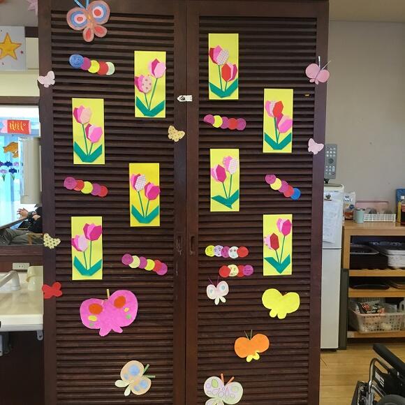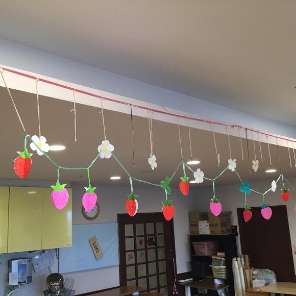 2025年05月01日(木) 5月のフロア飾りは… 5月は子供の日や母の日がありますね! 玄関には母の日の感謝を忘れずに、 中に入ると5月人形がお出迎え♪ 窓には元気いっぱいの鯉のぼりを泳がせて… 5月が旬のチューリップは綺麗に咲いております。 フルーツも旬のい・ち・ご♡がたくさん実っています! 皆さん季節を楽しんで創作してくれています(^O^) 毎月ごとのフロア飾りはどんなものになるか楽しみですね。