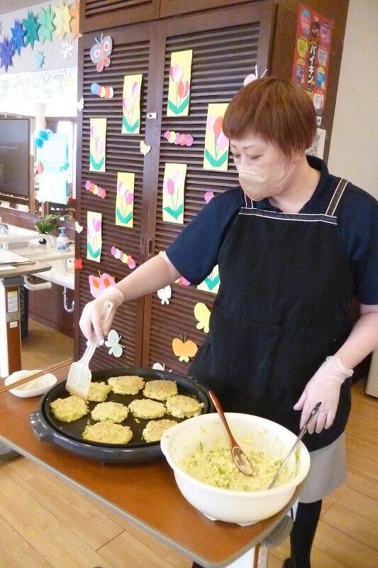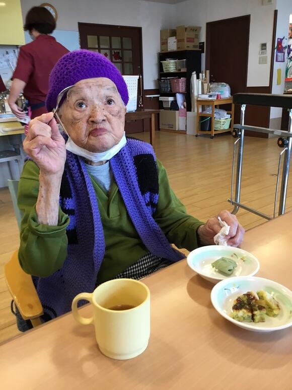 2025年05月06日(火) 子供の日 職員の手作りおやつ『お好み焼き』が出来上がるまで、 利用者様が昔遊んだ遊びの話をしていただきました。 子供の日という事で…柏餅に似せた錬り切りのおやつもあり、 皆さんおなかが満腹になりました!! 誰もが幸せいっぱいの笑顔で「ハイ!チーズ!!」 ばっちり写真撮れましたヨ♡