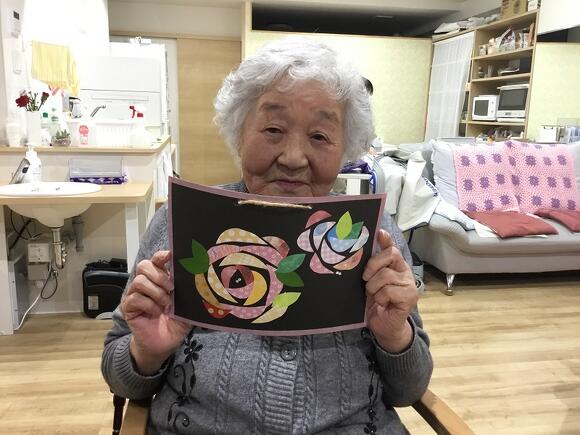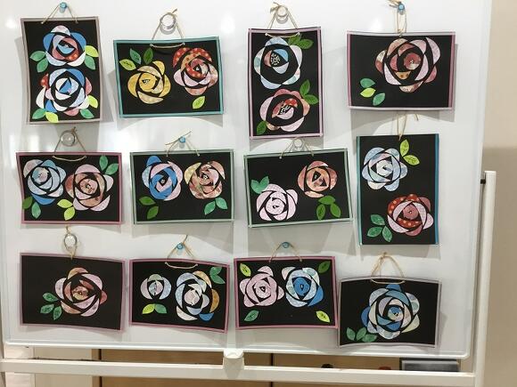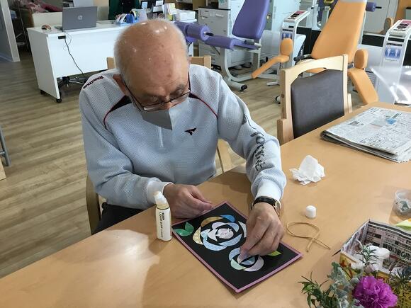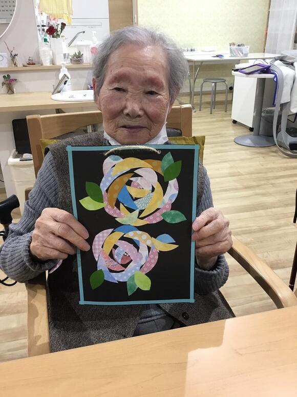 2025年04月09日(水) 薔薇が咲いた♪ 三日月のように切った色紙を何枚も貼り付けると何ができる? …なんと!きれいな薔薇 の花になりました! 4月の創作は「薔薇」の花をモチーフにした飾りを作りました。 薔薇の花に見えるように、バランスを考えながら 貼り付けるのが難しいとのことで、 皆さんとても集中して貼り絵をされていました。 出来上がった作品を並べると、とっても素敵で可愛くて、 拍手が起こりました! 頑張った甲斐がありました(^▽^;) お部屋に飾るのが楽しみですね~