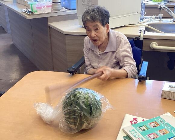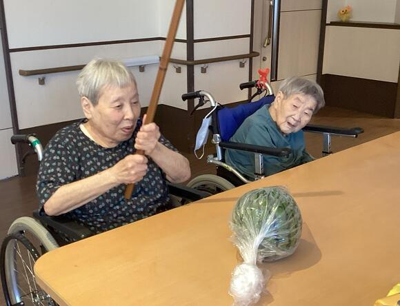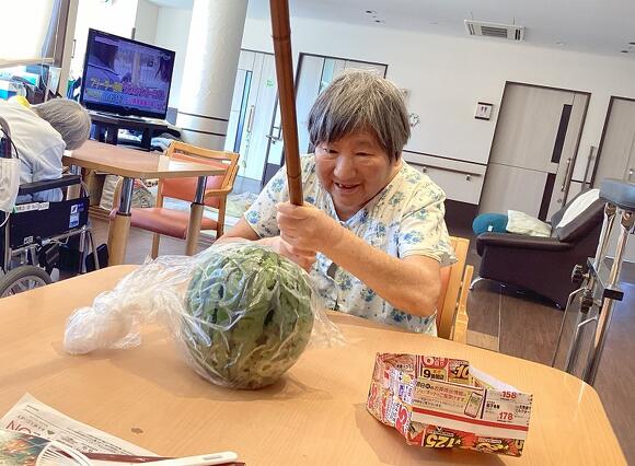 2025年07月12日(土) スイカ割り 毎年恒例のスイカ割りを行いました! スイカを見て「わあ~」「大きいねー」など 楽しそうな会話が弾んでいました。 棒を持って「それ!」「せーの!」と声を出し 力いっぱい叩いていました。 なかなかスイカを割ることは出来ませんでしたが 皆さん美味しそうに召し上がっていました。