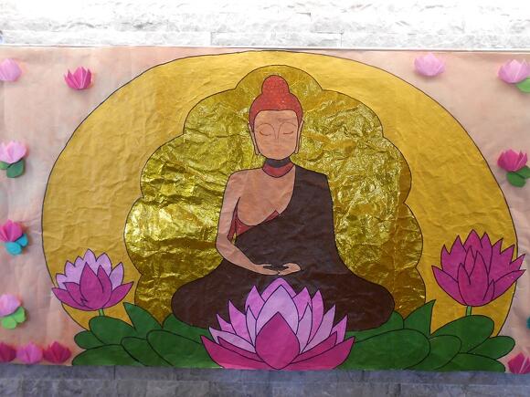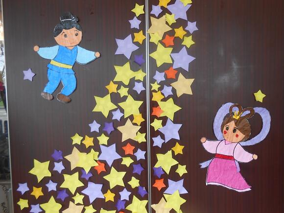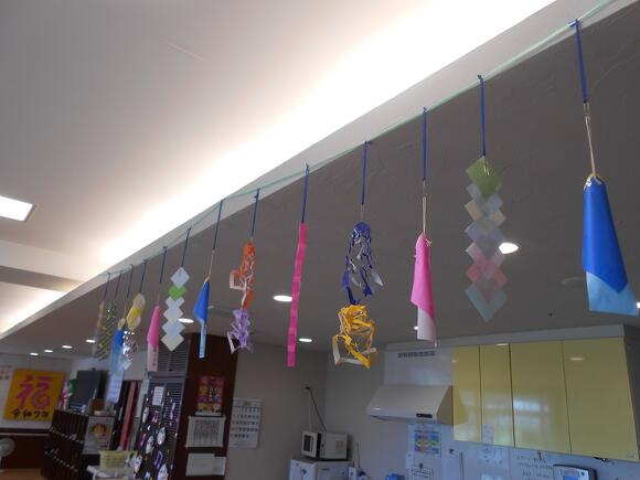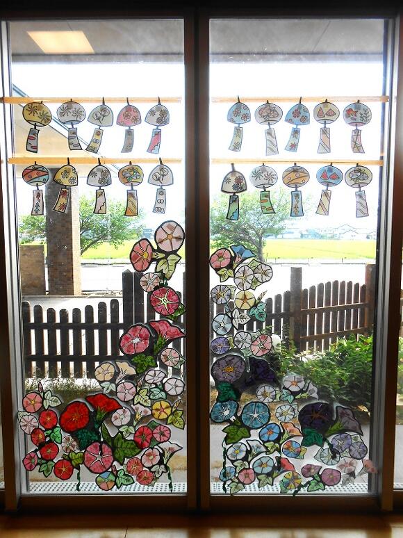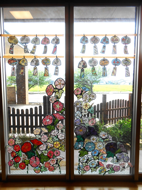 2025年07月01日(火) フロア飾り 7月のフロア飾りは、正面にお釈迦様。 窓は朝顔の貼り絵と塗り絵、風鈴の塗り絵で涼し気!! 吊るし飾りと自動ドアには 七夕飾りと織姫と彦星の貼り絵で七夕なイメージに☆ 朝、利用者様が来所されるとお釈迦様の貼り絵に手を合わせる方が(^O^) ステキな壁画に仕上がりました♡