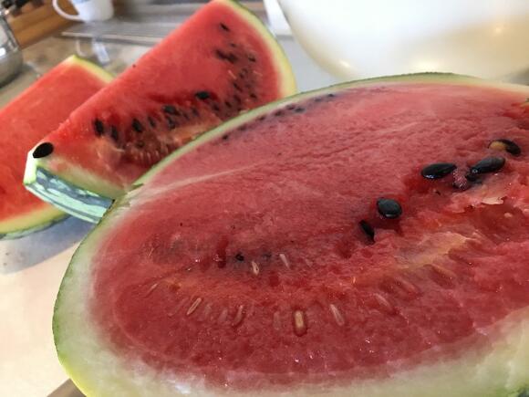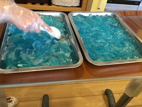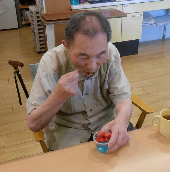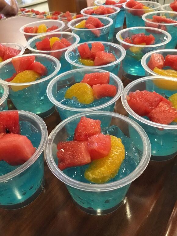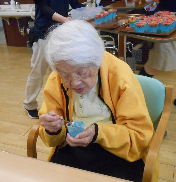 2025年07月25日(金) さわやかゼリー あつーい日にピッタリのさわやかなゼリーを食べました! (スタッフ手作りです♡) トッピングはみかんとスイカの華やかなゼリーです(*^-^*) サイダー入りの少しシュワッ??とした青いゼリーが さわやかで好評でしたよ♡