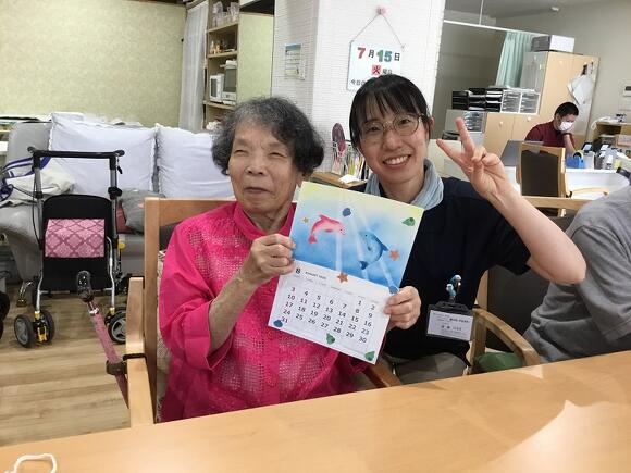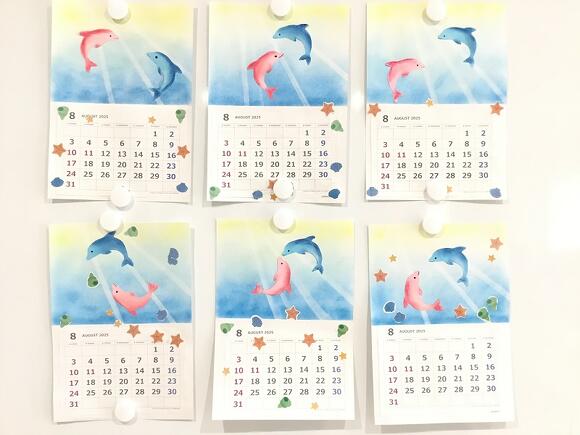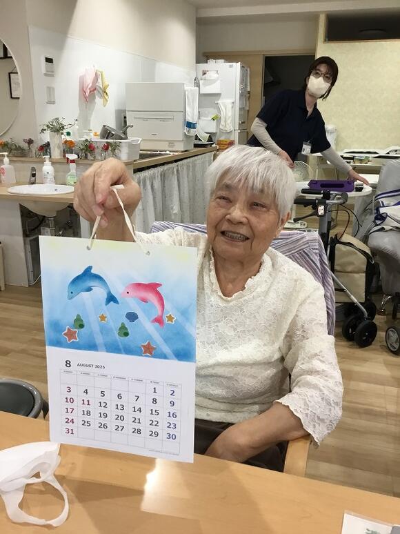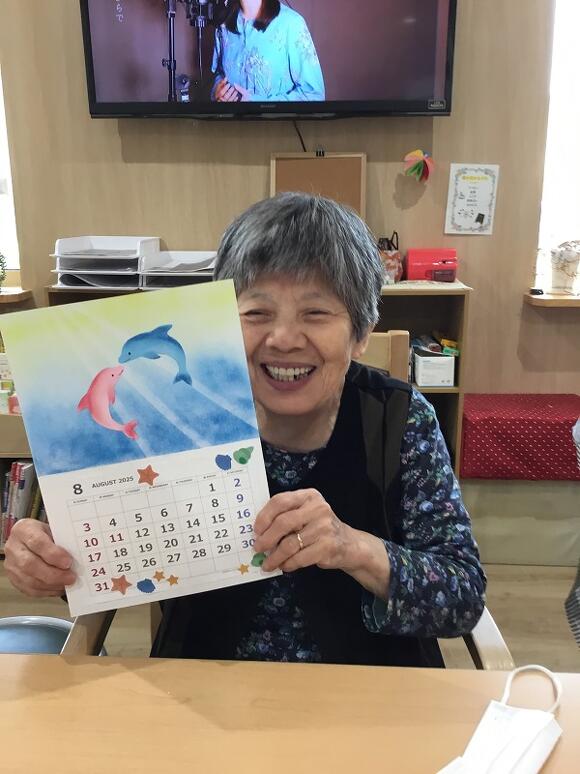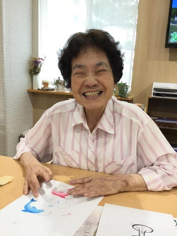 2025年07月15日(火) パステルアート いよいよ夏到来! 今月は、皆さんにイルカのパステルアートに初挑戦していただきました! イルカの形の画用紙にパステルを塗り、 指を使って色を広げたり、ぼかしてみると、 とても立体感のある仕上がりになるんです! イルカの配置は皆さんのお好みで貼ってもらいます。 「みんなそれぞれ違うね」 「キスしとるわ~(#^^#)」 「ひっくり返って遊んでるみたい」 と自然と想像力が膨らみ、会話が弾みました。