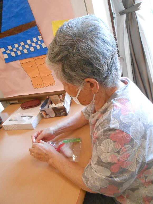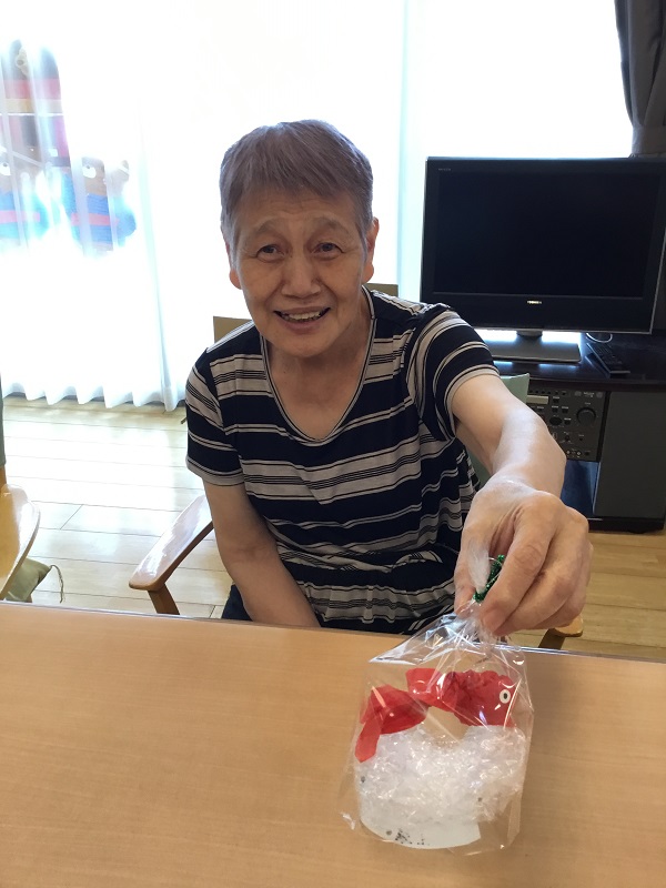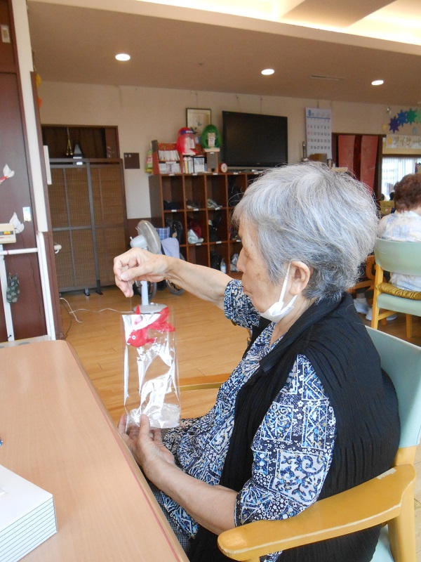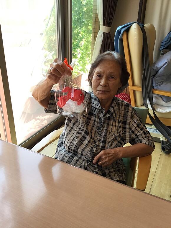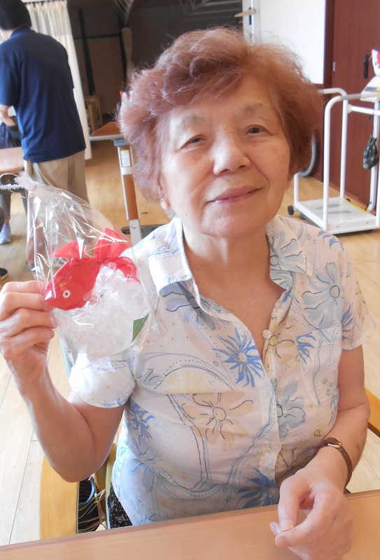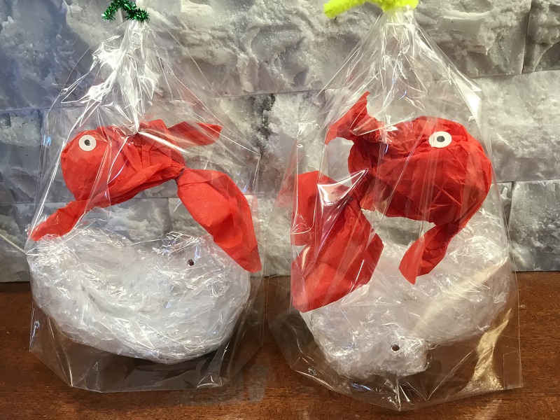 2025年08月04日(月) 涼を感じる「金魚」 8月といえば→夏 夏といえば→お祭り お祭りといえば→金魚すくい!! という事で今月は夏の風物詩「お祭りの金魚」を お持ち帰りしていただきます♡ ①花紙で作った金魚に目を書き入れ ②プクプクの空気をイメージしたキラキラな袋の中に ③くしゅくしゅにしたラップを入れ水に見立て ④袋の中に金魚をつるして …好きな色のモールで止めれば出来上がり~♬ 「かわいい~ねぇ」「よぉ考えたね~」 と嬉しい声がたくさんありました♬