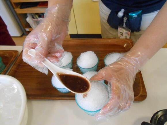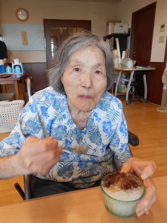 2025年08月06日(水) 沖縄風ぜんざい 暑い日が続き、日々の挨拶が「暑い…暑いわぁ~」 で始まってる今日この頃。 そんな暑さを一瞬でも忘れられるようにぜんざいを作りました。 ぜんざいはぜんざいでも、沖縄風ぜんざい!! かき氷の上に黒糖で煮た小豆(本当は金時豆なんですが…)を のせて食べて頂きました。 普段あまり食べない方も、ニコニコ顔で口にされていました。 「おいしいー!」 「小豆もちょうどいいあんばいで美味しいわ!」 との声が聞かれました(^O^)