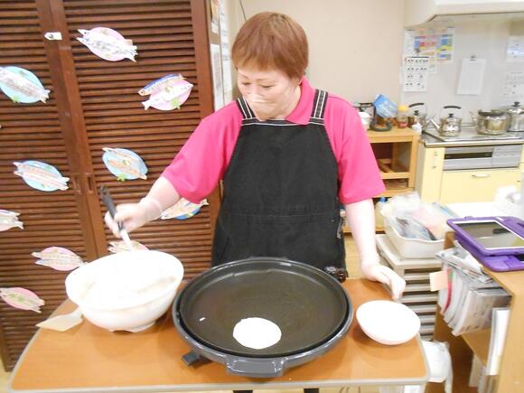 2025年09月06日(土) 9月6日といえば 9月6日は“黒の日”です。 黒といえば、何となく暗いイメージがありますが、 そこはデイサービスセンター菜の花です!! 明るく・楽しく・そして美味しく!! 黒ゴマをたっぷり入れたパンケーキを作りました。 そしてピーナッツクリームを塗れば出来上がり♪ 皆様、美味しく笑顔で召し上がられました♡