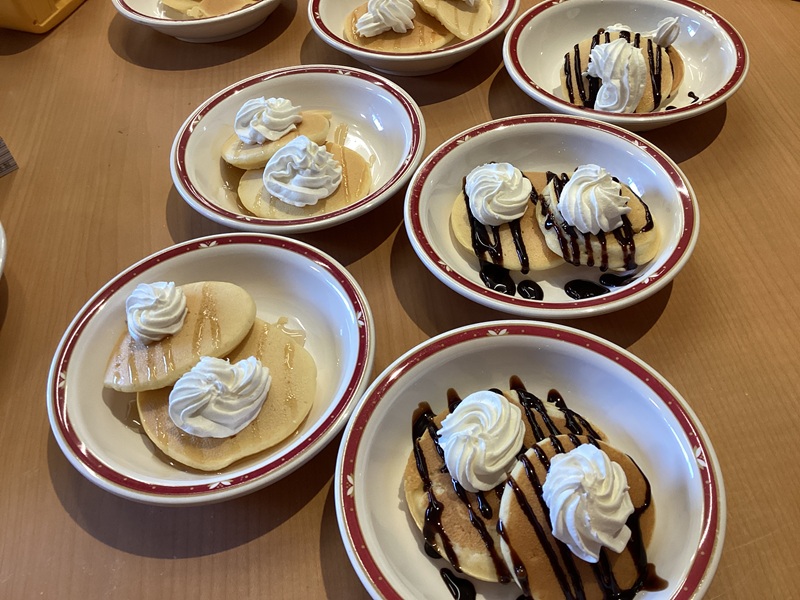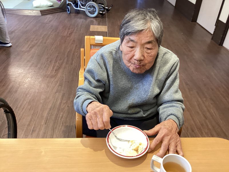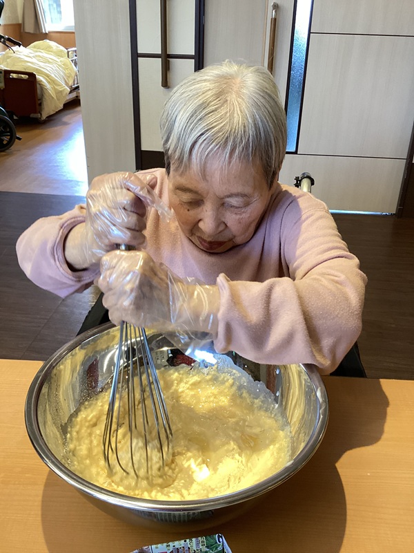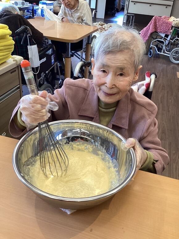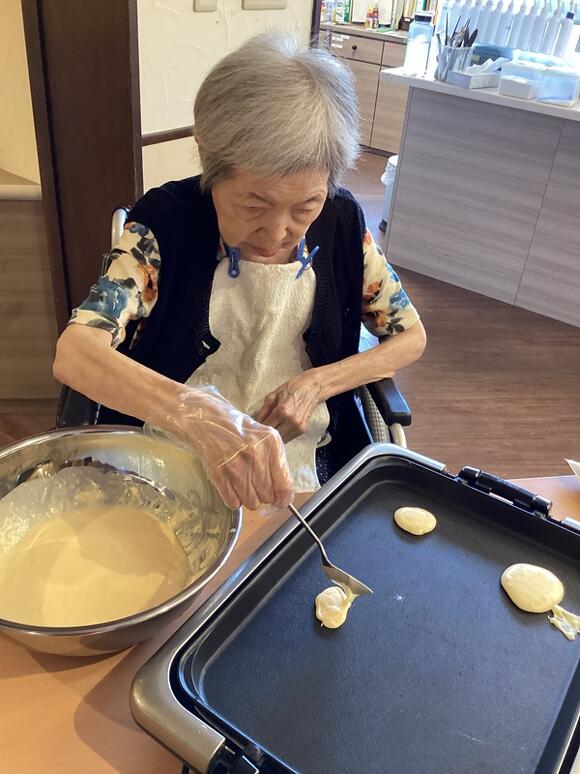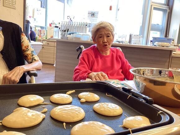 2025年11月19日(水) ホットケーキで心ホクホク♥ 皆でホットケーキを焼きました! ホットケーキミックスを一緒にまぜ、 ホットプレートに生地を置いて焼いてもらいました。 甘いいい匂いがし始めると 「いいにおいやね~」「早くやけんかね~」と皆さんワクワク♪ ひっくり返した焼き目をみて 「いい色やね」「はやくたべた~い♥」と食欲一杯! トッピングにホイップクリームとチョコソース・メープルシロップを 選んでもらい自分好みの味付けに! 「出来たてやし美味しい!」「毎日でも食べたい!」と大好評でした。